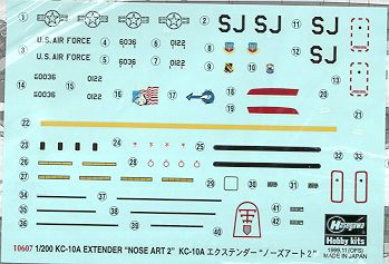First entering service in 1980 or so, the KC-10 fleet has been a real workhorse for the Air Force. In addition to being able to hold prodigious amounts of fuel, it also has a very large cargo-carrying capability. So far, of all the KC-10s delivered, only one has been lost, and that was due to a ground fire in 1986. When the first aircraft entered service, they were all assigned to SAC and painted in a very attractive scheme of white upper, grey lower with a large blue cheat line that wrapped over the cockpit section. This eventually gave way to the upper color being camouflaged in a dark grey that not only looked ugly, but faded rapidly and was a pain to maintain. This is the 'shamu' scheme shown on the box art. The current scheme is an overall AMC grey which will not as dark, still fades rapidly and is difficult to keep clean