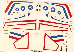 Instructions are completely in Chinese with color references in either Kiddyland or Tamiya colors. A small sheet in English is provided, but it provides only a history of the type, a set of warnings and a camouflage suggestion using three greys, obviously for the later production kits as the decal and painting guide are for the first plane in a very fetching red, white and blue color scheme. The decals are quite glossy and I'm not sure how opaque they are. Mine had curled into a tube so using them may require some recoating and careful handling when used. Fortunately, most of the colors can be painted on if it comes to that.