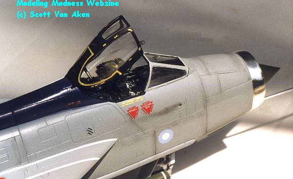 Now that all the basic bits are on the aircraft, this is the time I add the decals. Xtracolor's paints are a great starting point as they are quite glossy. I used the LTF scheme from Aeromaster's sheet 48-371 Lightnings Part III; Late Colors. The LTF Lion on the fin is printed in several sections to prevent mis-register problems and while a bit time consuming (as I let each part dry a full day), the results are superb. As with many decal sheets, all the common markings come from the kit decals. And here is whereI had some momentary panic. I chose a three-grey paint scheme and the kit decals are for bare metal Lightnings! That meant all their markings are in black where the grey Lightnings had white markings! Fortunately, I also have the F.6 kit so robbed the white markings from that kit. Not all the F.6 markings are for the F.3 so with both instruction sheets sided by side, I was able to piece together which ones I needed. WHEW!! Looking at this in hindsight, Aeromaster should have realized this problem and provided white markings; even if it meant an additional sheet and a price increase. A note on the kit decals. The ones for the F.3 are quite good, whereas theF.6 sheet is not very crisply done. Most of the white markings are blurredand illegible, while the black ones for the F.3 are easy to read. All the decals responded very well to Champ decal setting solution.