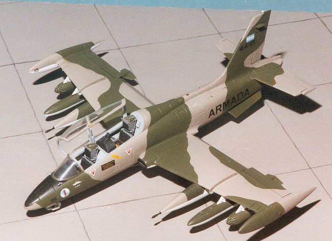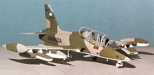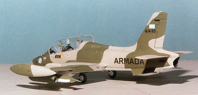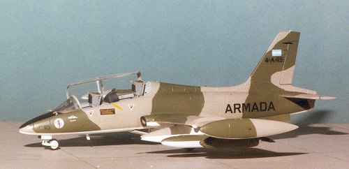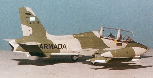I chose to do the Argentine version mainly because I wanted touse the gun pods and because I already had an MB.326 in that scheme. This schemehas a white underside color. I used Colors by Boyd white primer for this becauseit is flat and because it covers very well. The entire underside of the aircraftwas painted in this color as were the undersides of the tip tanks, wing tanksand gun pods.