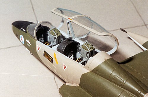 Then the seats were glued into the cockpit and the canopy then glued to theoutside of the hinge with the opening piston base glued to the hole in thecenter divider. The final bits were the pitot/static sensors to the top of thefront fuselage and then the small clear bits like the landing light, tailbeacon, taxi light and the four teardrop shaped anti-collision lights. These arevery small and may be tough to glue into place. I painted the two larger onesand one small one red with the other small one being done in green before gluingin place.