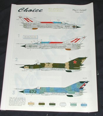 The kit can be built as an MF, bis, SMT or R,though the decals are only for an MF or SMT. The Russian camouflaged version canbe done as an SMT. The other two are Mig-21MF's. The Czech MF is a special 40thanniversary scheme and is quite colorful. The Cuban Mig has a number of colorphotos included as taken when this aircraft was flown to Key West by a defectingCuban pilot.
