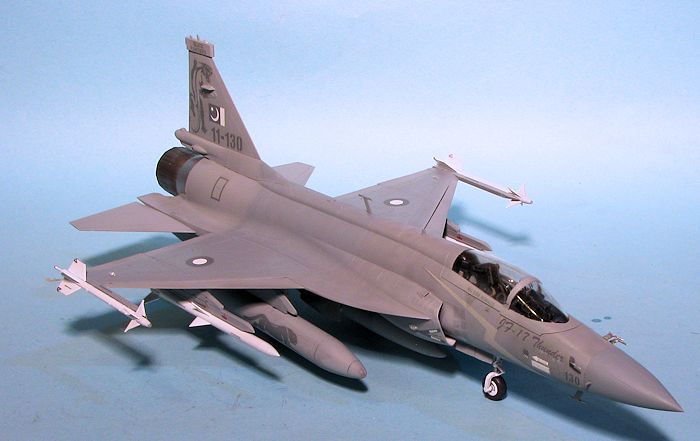 After attaching a few decals to the missiles, these were then glued onto their respective pylons. I then glued on the three drop tanks. These are not the same design as what photos of the real plane show. Instead of basically fat MiG-21 tanks with four small fins, the JF-17 in Pakistan service uses tanks with two large fins at 45 degree angles, much like what is used on the Jaguar. The very last part was to remove the masking from the canopy and afterburner. The afterburner interior was weathered using the AK International exhaust weathering set. I normally don't weather planes, but wanted to see how this set worked. I used the exhaust wash and burnt jet engine pigments and am pleased with the results.