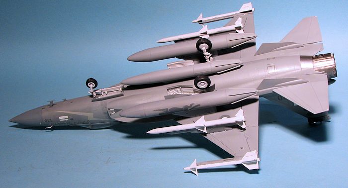 Intake trunking leading to a blanking plate is provided. The gear wells and landing gear are very nicely formed and are multi-piece constructs. The kit provides separate control surfaces, though it appears these are to be assembled in the neutral position. Weapons load is a pair of Sidewinders and a pair of AMRAAMS, or something similar. There is a centerline gun pod as on a MiG-21 and there are three auxiliary fuel tanks; two under the wings and one on the centerline of the fuselage. One does not have to install all these as it is up to the modeler to open the appropriate holes in the underside to mount these. I appreciate this as I don't always want to install everything on a model.