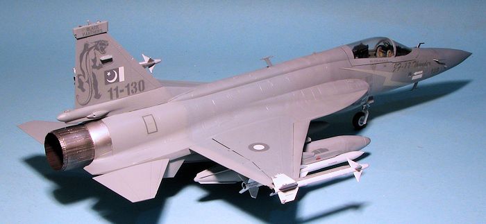 For decals I used Caracal Models sheet CD48014 that has markings for two operational aircraft. Naturally, I chose the one with the most markings. This was the plane based at Peshwar in 2011 with 16 Squadron and appears to be the wing commander's plane as it has his name on it. The decals are printed by Microscale and so I first tried Microsol setting solution on them. This proved to be insufficient so I ended up using Solvaset and even then required several applications and I was still not totally successful in getting rid of all the silvering. Note that the fin Panther needs to be cut to clear the antennas near the top of the fin. I did not apply the zillions of small stencils supplied with the kit decals. The airframe was then given a nice semi-matte clear coat.