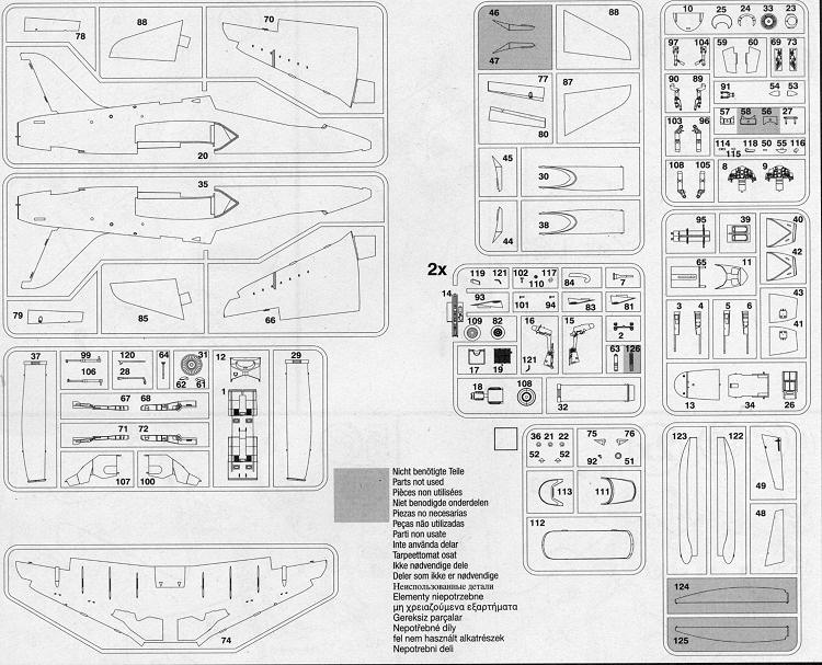 As this is a Red Arrows plane, it has the special oil tank for the centerline as well as a different rear fuselage plate that includes the nozzles for the three colors of dye that are injected into the exhaust. Parts not used are two other rear fuselage plates, the centerline gun pod and what looks to be a wing pylon. No stores of any kind nor any drop tanks are included in this boxing.