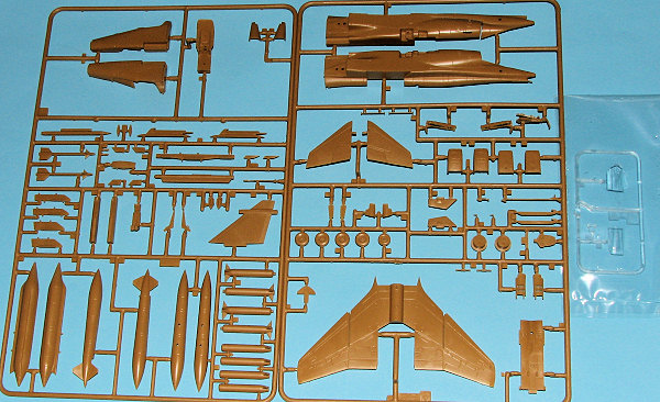 I cut the clear circular seal, expecting parts to come tumbling out of the box. Lo, they were all neatly sealed inside a nice polybag. The details didn't look raised either, but nearly as good as anything Hasegawa could put out. Once the bag was opened and I had a chance to look over the two large tan sprues and the smaller clear one, the more I thought this was a VERY close copy of the Hasegawa kit. Same separate front end for doing either a single seat or a twin seat version. Same separate nose for the British rangefinder or French smooth nose, same separate windscreen and canopy, same ejector towers in the exhaust and so on. Lots of 'sames', but perhaps it is that there is only one way to mold a 1/72 Jaguar. This kit has separate wing fences to facilitate installing the Sidewinder rails, a nice pair of wing drop tanks and a camera pod for the belly. It has sidewinders and some interesting looking bombs.