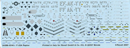 Instructions are standard Revell with 59 well illustrated construction steps. All paint references are for Revell paints and you have to mix all the exterior colors. Fortunately, the FS 595 numbers for these are also provided. The rather large and well printed decal sheet is by Cartograf so you know you'll need your strongest setting solution if you use such a thing. All the units operating the type at the time of this kit's release are provided. Four are for the 1st FW at Langley with the 1 FW boss, two different 94 FS markings and one for the 27th FS, two are with the 90th and 302nd FS at Elmendorf Alaska (looks like the ex-Luke reserve unit's number has been transferred to keep all the Tuskegee units going), and one is with the 43 FS at Tyndall, a unit that I believe, used to be at Elmendorf. The sheet also includes missile markings as well as airframe data markings.