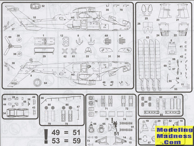 Molded in a green plastic, the detailing is quite good. There is a nicely done cockpit with both a collective and cyclic control. Pedals are molded into the floor and you get the proper armored seats. Decals are used for the instruments.