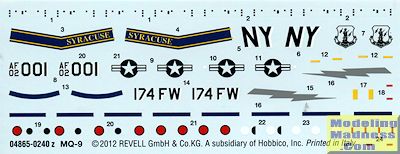 One set of markings is included, that being the 174 FW, New York ANG, an ex-F-16C unit from 2011. Revell provides only Revell paint references, making this company as irritating as Tamiya and Airfix in this regard and does not provide FS 595 colors. For the record, the aircraft are FS 36375 upper and FS 36176 on the underside. Note that the 174 Fighter Wing as on the decals is now the 174 Attack Wing.