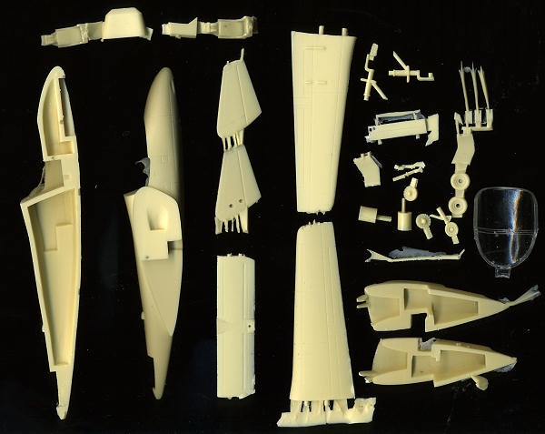 Molded in Anigrand's usual tan resin, the kit has nicely engraved panel lines. The one piece flight surfaces will make building a bit easier than most with the wings and fins provided with pins/sockets for proper alignment. The cockpit is equipped with two ejection seats, two control sticks and an instrument panel with built in dash panel. There isn't a ton of room for nose weight and this kit will need all it can get. The nose wheel is molded in place with the nose gear so should supply enough support for the kit. As you can see, parts clean-up will consume some time as will fixing the usual air holes, especially those on the wing tips. A one piece clear resin canopy is provided. It could use a dunk in Future to increase its clarity and my sample had some sort of detritus in the resin around the canopy/windscreen that cannot be removed.