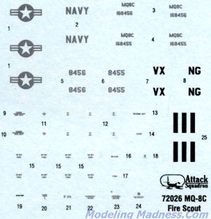 Instructions are well drawn and in English, providing detailed information on several aspects of the build. The drawings are quite well done and show precisely were all of the pieces are to be placed, so that even a beginner should have no issues during construction. The decal sheet contains markings for two aircraft One has a VX tail code and the other an NG code. A web search will find photos of the aircraft with both
