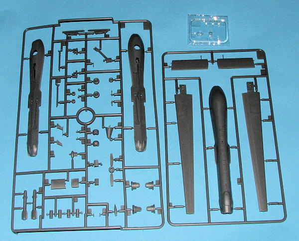 Molded in two grey and one clear sprue, there sure doesn't seem to be a lot for your $40 but the parts are very nicely molded. There really isn't all that much to the kit. There are two optional builds, which is why there are two lower fuselage halves. One of them has a large blade antenna in between the main landing gear so there is a large mount on the one half. The other doesn't. Looking at photos in the reference, it seems most do not have this. But it could be a recent addition. There are also optional FLIR pods, upper fuselage antennas and different engine cooling scoops.