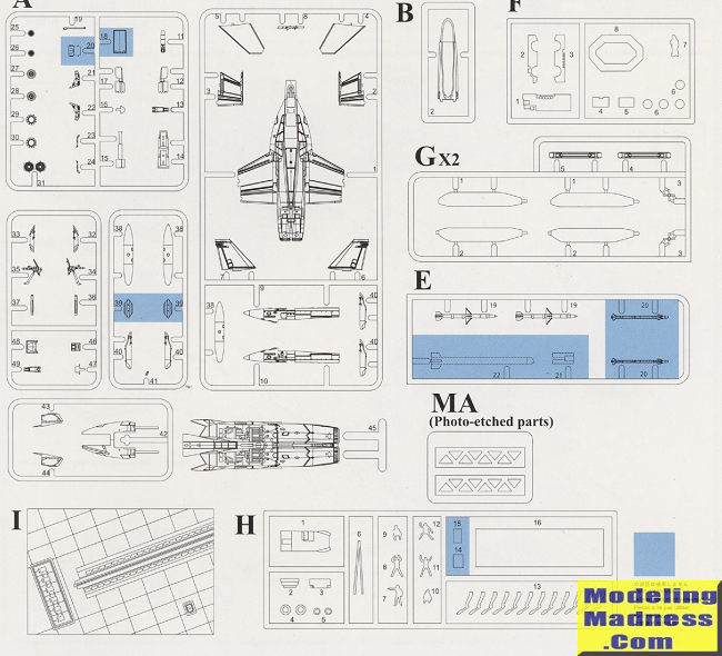 The upper fuselage includes the inner wings while the lower is in two parts and includes the nose section into which the cockpit fits. Wing tips are separate items and can be modeled folded if one so wishes. Also separate are the horizontal stabs and the fins. Landing gear is nicely detailed and all the gear doors have to be cut. The nose gear alone is four very small pieces. You could do this in flight, but then what's the point in buying the version with the carrier deck. There are pylons for the Jamming pods as well as wing tip pods. Each of the wingtip pods has teeny photo etch fins that are required for stability on the real deal