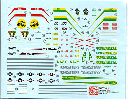 Markings are for two CAG birds as shown on the box art. One is from the ex-F-14D unit, VFA-31 'Tomcatters', and the other is from an ex-F-18C unit, VFA-105 'Gunslinger'. Both are in the standard paint scheme with black tails while the VFA-31 plane has black on and around the cockpit area. Not only will the black cockpit surround have to be painted, but so will the thin red stripe around it as I didn't see this stripe in with the decals. Too bad as this will prevent most from choosing this nice scheme. Decals are well printed and if up to Dragon's normal standards, will work well with most setting solutions.