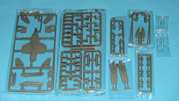 Anyway, the sprues are quite nicely detailed with engraved panel lines which, while grossly out of scale as you'd expect, do provide what modelers want and look very nice once under a coat of paint. Naturally, the kits are designed to make conversion to the F-18E a snap by simply adding another upper fuselage insert for the shorter cockpit section. However, we are talking F-18F in this one so the insert and nice, clear, canopy are for this version. The cockpit is pretty much devoid of panel detail, though you do get a pair of believable bang seats and instrument panels.