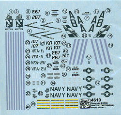Markings are for two standard line birds, a nice change from the fancy CAG planes. There are two sets of markings. One for VFA-213 and the other for VFA-11 as shown on the box art. Decals are well printed and if up to Dragon's normal standards, will work well with most setting solutions. In case you are wondering, the grey stripes are for the trailing edges of the wings and rudders.
