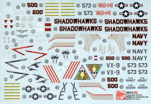 Markings are nicely printed and are for two aircraft. One is for VX-9, the operational test squadron while the other is the CAG bird for VAQ-141 'Shadowhawks', the second operational fleet squadron. The fins and upper spine will need to be painted black on this one. The usual Gunze paint references are provided as well as FS 595, which is good as Gunze is getting very scarce in the US.
