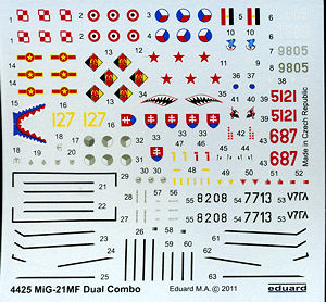 Instructions use Gunze paint references and it looks as if some colors (like the turquoise cockpit shade) will need to be mixed if using Gunze paints. Of course, if using Testors enamels, you simply buy the color ready mixed. The full color instructions also include the markings guide for eight options. There are two Czech, a Slovak, an Egyptian, a Russian, a Vietnamese, an East German, and a Polish aircraft in various camo schemes. The decal sheet is quite comprehensive and aside from the Egyptian roundels being off register, is well printed. The set also includes masks for the canopy and various antennas, a nice thought though one will need magnifying lenses to see some of these!