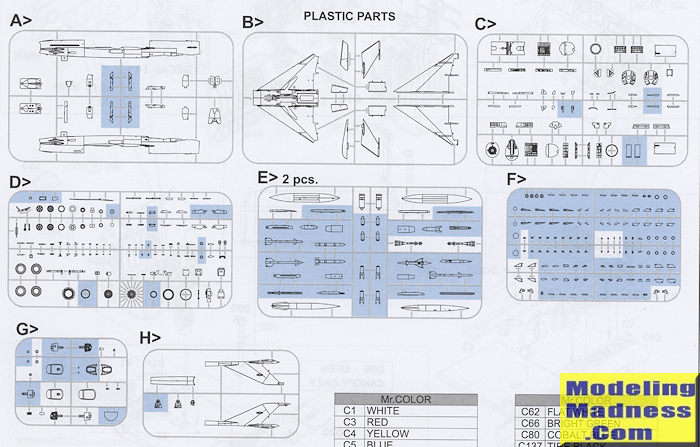 On the wings, the builder will have to assemble the multipiece wing wheel wells. Any pylons will need the holes opened up as well. The kit provides separate forward speed brakes if we want to cut away the ones molded into the bottom of the wing so these can be displayed open. I dare say few modelers will do this. There is a separate rear speed brake assembly for open or closed. Landing gear are properly complex and should look quite good when done. A goodly portion of the sprues are for fuel tanks, pylons and weapons. One will choose what one wants to use fairly late in the build process. Some of these have a multitude of small parts as Russian weapons seem to have a lot of tiny fins. Interestingly, the instructions only show a pair of RS2-U2 missiles on the inner pylon and fuel tanks on the outer.
