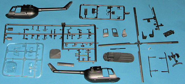 The cabin is pretty bare with but a floor, bulkhead and a bench seat for the back wall. The modeler can cut open the doors and the rear access panel if one wishes. Helicopters need decent clear bits and this one has them. Though a bit old f