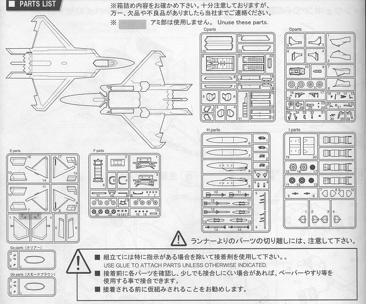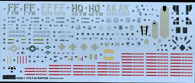 Instructions are very well done and while in Japanese, the 22 construction sequences are very well drawn. Color information by Gunze, of course. All of the external camouflage colors need to be mixed and a ratio is provided for that purpose. Markings are provided for four aircraft; the 1st Fighter Wing at Langley AFB in Virginia gets two of them along with one from the 49th FW, the ex-F-117 wing at Holloman AFB in New Mexico and another from the 302 FS based in Alaska. The decals are very well done and provide not only full stencils for the aircraft but for the weapons as well. A goodly portion of the sheet is for 'remove before flight' tags which will be hanging all over the aircraft when on the ground.