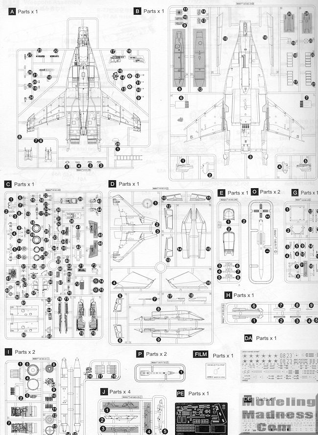 Another change is in weapons load. GWH still provides its missiles in a protective package as before and they are mostly one-piece, which I like as I hate adding separate fins to missiles. There are four R-73 and two R-77s, with the rear fins of the R-77s being separate. Of course, if one uses the different fuel tanks for this variants, you won't be using the R-77s. Both the weapons and fuel tanks take different pylons and those are also included.