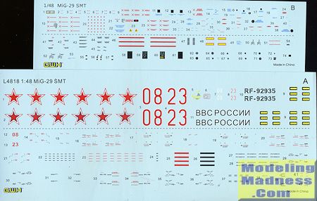 Instructions are well done, though a bit crowded so care will be needed during build to be sure all the small parts are accounted for. Paints are the usual Gunze reference. The two options are both Russian from the late 2000s and are in a three grey splinter scheme on the upper surface with a solid grey underside. Two decal sheets are provided with most of the markings airframe and weapon stencils.