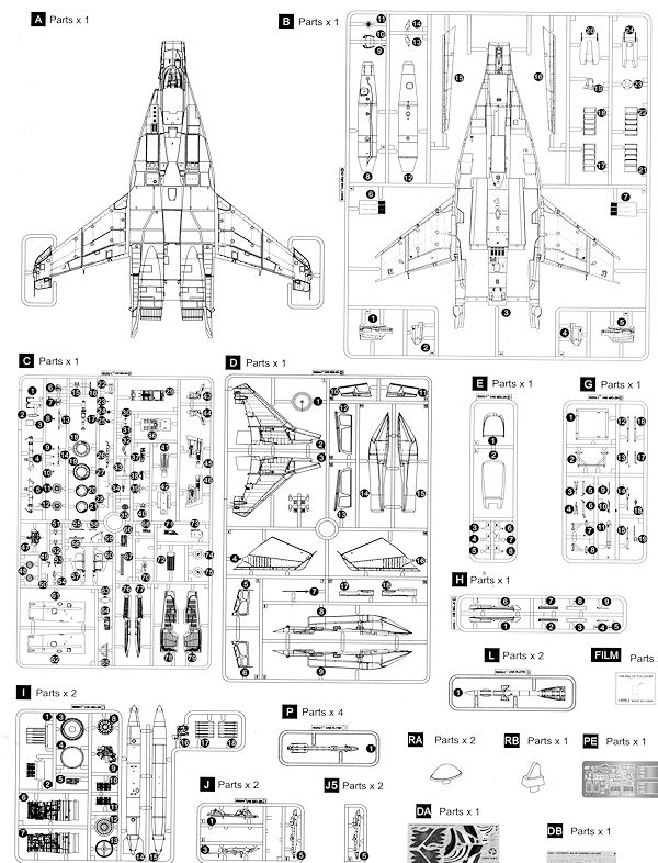 There are three sheets included in the kit. I've shown the largest of them with two other much smaller sheets for the codes and data markings for the airframe and the missiles. These sheets are protected in a heavy plastic folder, a nice idea to keep them undamaged. The printing on the sheet is superb and will make for a very colorful model when done. The instructions are very well drawn and provide all the information you will need to build the aircraft of your choice.