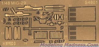 I will point out now that the canopy and windscreen have a seam running down the center of them. This is required to get the proper 'bubble' shape as single molds will not do undercuts. There is a photo etch fret for seat harness, gun sight, some intake screens and the tiny vanes for one set of missiles, to name a few items. This fret has been updated as the earlier boxing had the wrong shape intake screens. The interior has ruder pedals, a nicely done seat and separate side consoles. The consoles and instrument panel have raised detail and there are individual instrument decals for the main panel.