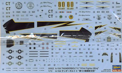 You get a set of the original instructions for kit E9 with a small addendum sheet so you can apply the decals included. Both markings are for a grey 118 FS Connecticut ANG plane. One is the box art plane with special paint for it s 80th anniversary while the other set of markings are for a standard line bird from the same unit. As a note, the 118 FS transitioned to the C-21A in 2005. Those wishing to portray another unit can do so with all the aftermarket decals that have been done for this plane. I would like to think there is also an upgrade set for this kit to make a more modern A-10A or even the A-10C.