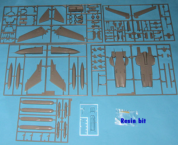 For things under wings/fuselage, you have a pair of wing tanks with Sidewinders for the inner pylon, a set of ECM pods for the outer pylons, and what looks to be a cluster bomb dispenser for the centerline. I should mention that the resin shard fits opposite the targeting window on the underside of the nose. You'll also have to open holes in the wings for the pylons and fill in the left side gun as that space is taken by the electronics for the FLIR.