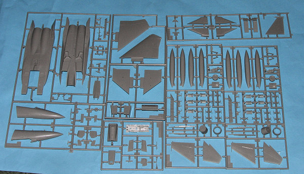 The cockpit section includes raised detail on the instrument panel and side consoles as well as decent detailing in the electronics bay behind the cockpit. Decals are also provided for the instruments if you so wish. There is an actuating ram for the canopy so it can be shown in the open position as can be the speed brake, which is normally closed except when using it or showing off at air shows. The modular design of the kit allows for either a single seat or two seat nose to be attached to the rest of the airframe. This forward section is split vertically while the fuselage is split horizontally. There are not any long intake trunks on this kit, though there is a blanking plate with a compressor face. Wings are build separately from the fuselage and slotted on at a later time.