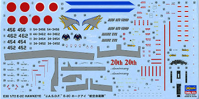 Markings are for any of four aircraft in the standard light gull grey over white scheme used by many E-2 operators. The modeler can do any of four aircraft and there are a few differences between them in terms of antenna suites. These are clearly shown in the instructions. You can do one of four planes. One is the introduction aircraft, two are standard scheme planes and the fourth is a special livery for the 20th anniversary of type operations. The well done decal sheet also includes all the walk areas.