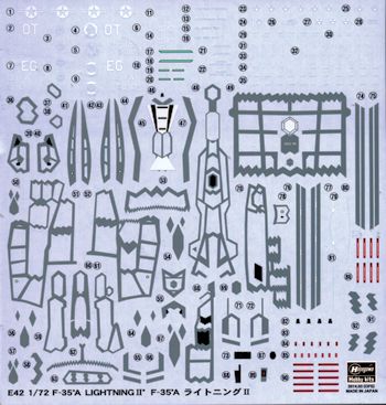 Markings are for two aircraft; one is from the test unit at Nellis AFB and the other is for the training squadron at Eglin AFB. The decal sheet is quite comprehensive as this plane has all sorts of panel line decals. The proper color of the F-35 hasn't been produced in premixed paints so Hasegawa has gone with something close. All the lighter panels are to be painted FS 36270. Then they need to be masked and the rest of the airframe painted Neutral Grey. Apparently this will provide the necessary slight difference in greys required. All colors are Gunze references. The decal sheet is very nicely printed and should prove no problem.