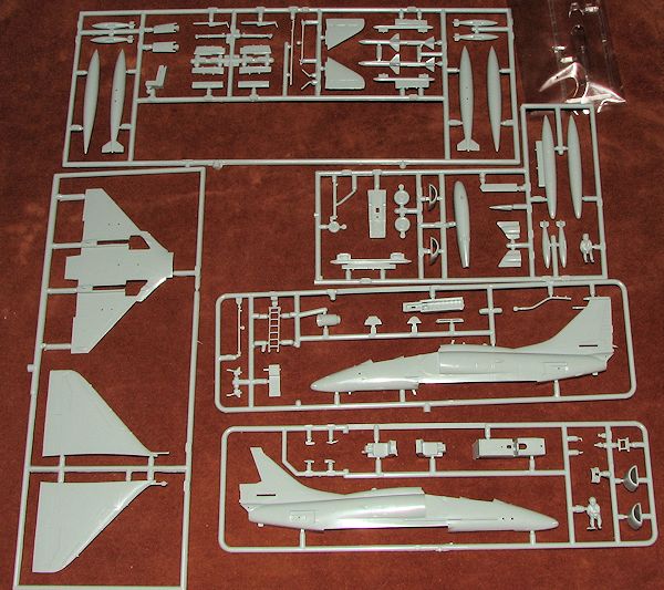 Newer sprues are for the fuselage, clear bits, seats, and the intakes to name a few. The raised panel lines are nicely done and for a kit as old as parts of this one are, there isn't all that much flash. The kit also includes a boarding ladder as well as crew figures. Fortunately many of the older parts, which are now embarrassingly crude, are not required. There is a separate windscreen and canopy alon