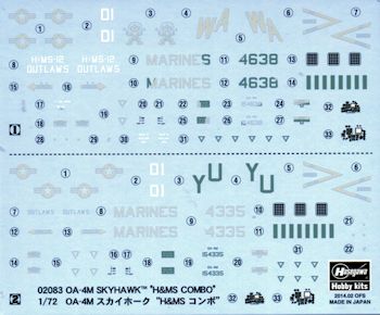 Markings are provided for two aircraft, both in the TPS as shown on the box art. The box art plane is from H&MS-12 'Outlaws' in 1985. The other is with H&MS-13 from 1987. The TPS scheme is FS 36495 on the underside with FS 36375 and 36320 on the upper surfaces and sides. Decals are nicely printed and provide full markings for both aircraft.