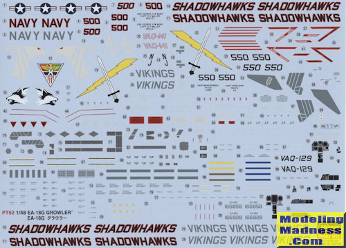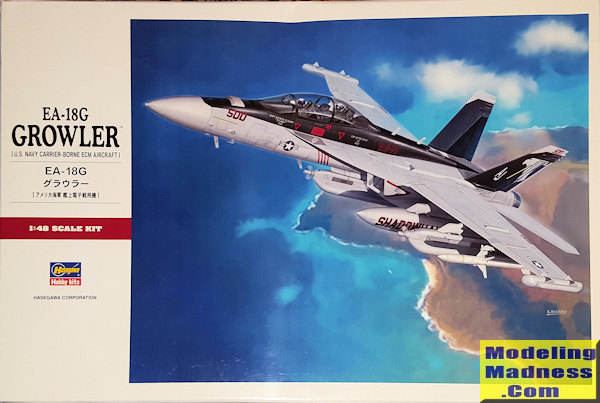 Instructions are well done with the usual Gunze paint references. As usual with a kit of this complexity, things are a bit busy, but if one takes their time, it will all go together well. Markings are provided for two squadrons. Both are CAG birds in FS 36320 over 36375, the two greys being quite close to each other in shade. One is from the training squadron, VAQ-129 while the other is the box art plane from VAQ-141. All the black/dark blue-grey areas will need to be painted. The decals are very nice, and include a full stencil suite.