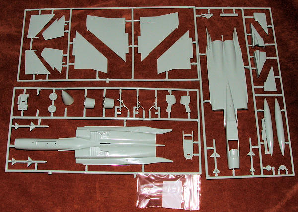 Also typical of the time, the cockpit is minimalist with a decal for the instruments and a basic seat shape. The seat in this kit was missing, hence the low price. The kit also does not have wing pylons and only has four Sparrows for the fuselage stations. It does have a centerline tank with the pylon molded onto one half of the tank. The plastic itself is somewhat thick and past experience with these types of kit has shown it to be a bit on the hard side. The raised panel lines are well done and you will find ejector pin marks on all sorts of parts, including the wheels and inside the gear doors.