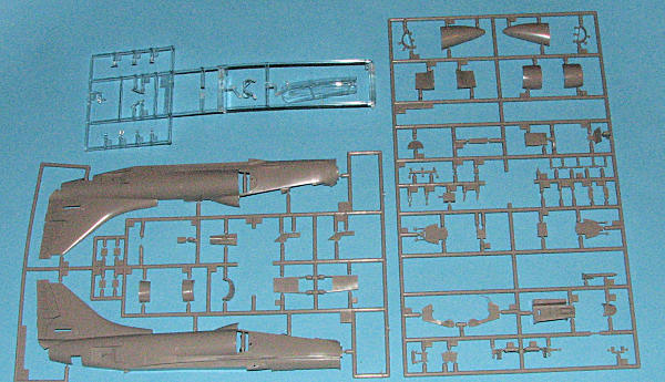 As you might imagine, Hasegawa has chosen to base this kit on their previous A-4E/F by providing one full new sprue and additional inserts to two existing sprues. One of those is the clear canopy and windscreen, while the other is the sprue that normally holds the fuselage halves. The other is an an new sprue that includes the additional pieces for the interior and the nose of the kit. One might be tempted to think that Hasegawa will do an OA-4M, and it could be done, but the canopy, windscreen and canopy attachment area are quite different and would need some additional pieces.