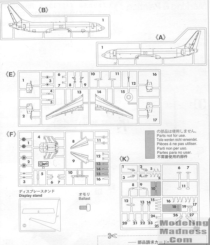 So it turned out to be. The 737-800 is one of their relatively newer line of kits. It includes a fuselage bare of windows, a hefty nose weight, the standard Hasegawa 1/200 display stand, a set of 'wheels up' bits that simply plug into place and the older style engines. By this I mean that the engines are not the single mold that the newest kits offer. The newest kits also have horizontally split fuselages and this one is the 'standard' vertical split.