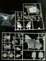 So, what's in the box? Well, you get two well done sprues of somewhat thick, raised panel line plastic. The kit includes a nicely molded one-piece canopy and while there is no cockpit detail, there is a pilot figure to paint. For things under wings, a pair of missiles that are probably supposed to be Sparrows, but look like Harpoons are included. There is something missing from this, the third incarnation of this kit and you can spot the absences from the gaps in the sprues. While the Phantom Boy figure is here, gone are the cart, bombs, Gatling gun and stand that came with the earlier incarnations. I'm not really sure why they decided to leave these off unless they didn't want to bother with the piece of bent wire that was required with the stand.