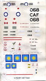 Instructions are on a folded sheet of paper with five construction drawings. No color information is provided for the interior or wheel wells or gear legs. There are markings provided for three planes. Two are overall aluminum lacquer or bare metal with red areas as assigned to 2 CFFTS in 1985 and 1996. These differ in the 'Canada' markings with the older one having the squadron badge on the rudder. The third option is for a CL-41G of the Malaysian Air Force in green over light grey. My decals were toast due to water damage, but since this is a rather early boxing, I would guess that even perfect decals would prove to be useless.