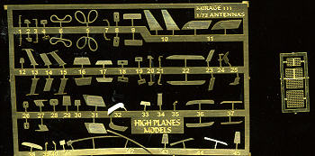 As you might expect, more detail is added with a photo etch fret. this covers things like the chaff/flare dispensers and various antennas and other sundry pieces. I'm thinking this fret is used on a number of Mirage and Cheetah kits as there seem to be a lot of bits that won't be used.