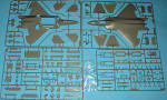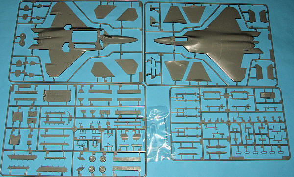 This is a new mold (2009) kit and typical of Hobby Boss, it is really quite well done. Molded on four grey plastic and one clear sprue, the kit has your usual engraved detailing and to make it worth thei money, at least in the eyes of Hobby Boss, it has full weapons bay detailing. Not only that, but a first in F-22A kits in this scale, it has wing racks for JDAMS. I've not been following this aircraft much so I wasn't aware that it had any ground attack capabilities, but apparently so. Also typical of Hobby Boss, the holes for the wing racks are already opened up. Frankly, I wish they would not do that as perhaps I don't want to install the wing racks and bombs.