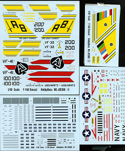 The kit does include a full weapons suite, including different wing pylons if you wish to mount a pair of Phoenix out there. You get four Sparrows and two Sidewinders as well as a pair of drop tanks. The instructions are well done with the usual nicely drawn construction steps. There is a list of parts that won't be used on this variant, which is nice to halve. A full color painting and markings guide is offered for two light gull grey over white planes; one from VF-32 as shown on the box art and another for a black nosed VF-41 plane from their initial operations. There are five decal sheets (the one for the instruments isn't shown) that provide all the data and unique markings you'll need. They are well printed and I've found them to be quite good when I've built Hobby Boss kits. | CONCLUSIONS |