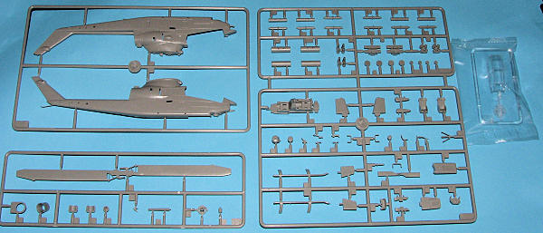 The baseline AH-1S, and subject of this kit, is an AH-1Q upgraded with a 1,800 shp (1,300 kW) T53-L-703 turboshaft engine. The AH-1S is also referred to as the "Improved AH-1S", "AH-1S Modified", or "AH-1S(MOD)" prior to 1988. (Prior to 1988, all upgraded aircraft were referred to as variants of the AH-1S.) From what I understand, they were all redesignated AH-1F. The Cobra has been exported to a number of countries including Japan, Israel, North Korea, and Jordan.| THE KIT |
