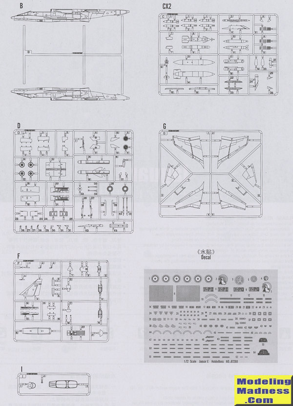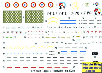 Instructions are well drawn and you are provided with two markings options. Both aircraft are from EC 2/7, the training outfit for the Jaguar. One is the box art plane in the standard European scheme of green/grey/silver. This aircraft has the larger, older markings so the yellow surround insignia are appropriate for this plan. The other is a much later camouflage scheme, a modified 'Tchad' scheme with three browns. This one needs the roundels without the yellow surround and you'll have to go elsewhere to find these as Hobby Boss did not include them in the sheet. Aside from the omissions mentioned, the sheet is nicely done and includes all the required markings for ordnance as well as the airframe. In fact, the ordnance markings take up most of the sheet. These planes were not normally armed and often carried little more than external tanks.