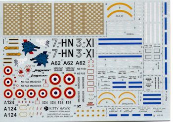 instructions do have a load out chart. No fuel tanks are included and the only thing that will fit to the fuselage pylon is the big AS-37 missile. Instructions are well done with Gunze paint references. I find it interesting that you are supposed to completely build the nose section and the rear fuselage section with all the weapons attached before joining them together. I would hazard a guess that the person who developed the instruction sheet has never actually built a model. Markings are for two planes. One from EC 1/7, 7-HN in the 'Tchad' scheme of three browns in a wraparound and one from EC 3 coded 3-XI in the standard European scheme. EC 3 flew few Jaguars and only for a short time. I was able to find six slides of a 7-HN in my collection, but all six had different serial numbers from the one being kitted. Only had one 3-XI and it was also a different serial. So no accompanying photos. The decal sheet is well done and includes a lot of weapons markings as well as those for the two aircraft options.