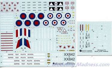 Instructions are well done with Gunze paint references. It seems to be typical of many modern kits that you are supposed to completely build the nose section and the rear fuselage section with all the weapons attached before joining them together. I would hazard a guess that the person who developed the instruction sheet has never actually built a model or is quite young and not fumble-fingered. Markings are for two planes. One is the very colorful box art airplane from the Empire Test Pilot's School in the 'raspberry ripple' scheme. The other is from 2 Squadron in a standard green/grey wrap camouflage scheme. The decal sheet is well done and includes a lot of weapons markings as well as those for the two aircraft options.